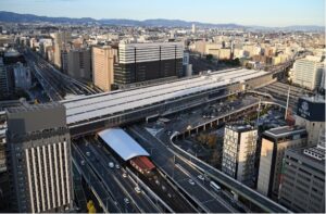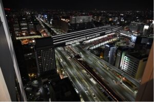 新大阪駅近くの高層ビルから下を見下ろすと、路線が交わる壮観な姿が見えます。この街が、アクセスが容易でビジネスがしやすい場所であると実感できます。