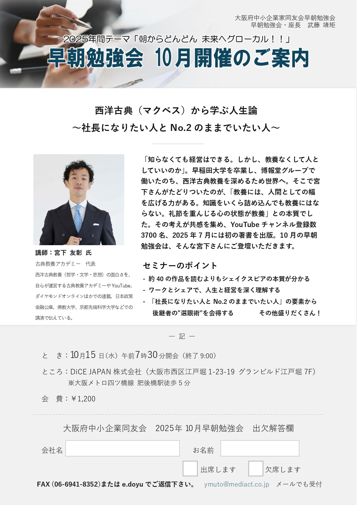 2025/07/16 (水) 7:30 新規事業に取り組む前に おさえておきたいマーケティングの勘どころ(2025/07/16) 勉強会・セミナーブランディング経営戦略 早朝勉強会 大阪中央ブロック 詳細はこちら