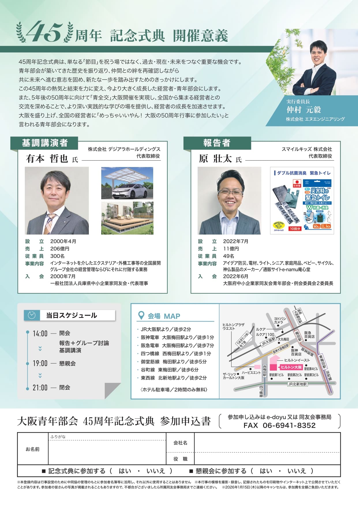 この 45 周年の熱気と結束を力に変え、今より大きく成長した経営者・青年部会にします。