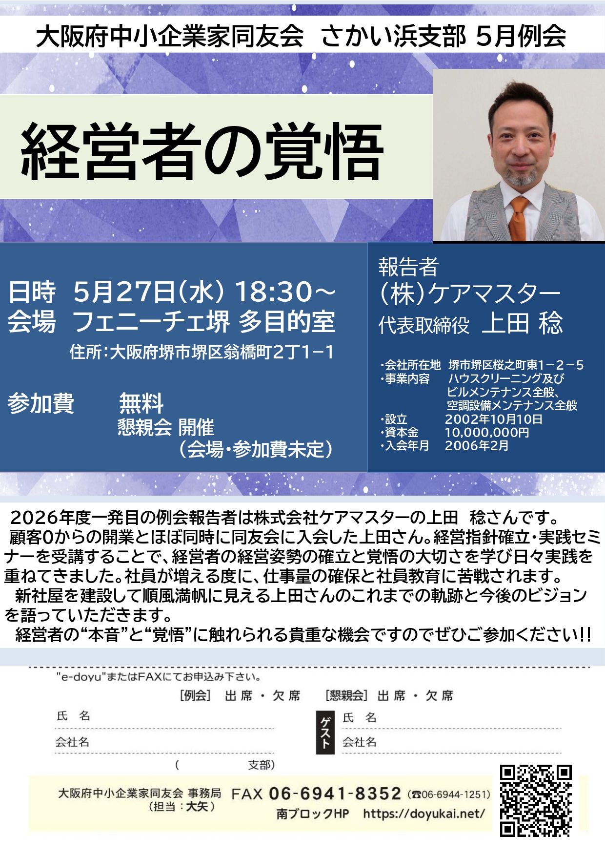 2026年度一発目の例会報告者は株式会社ケアマスターの上田 稔さんです。
