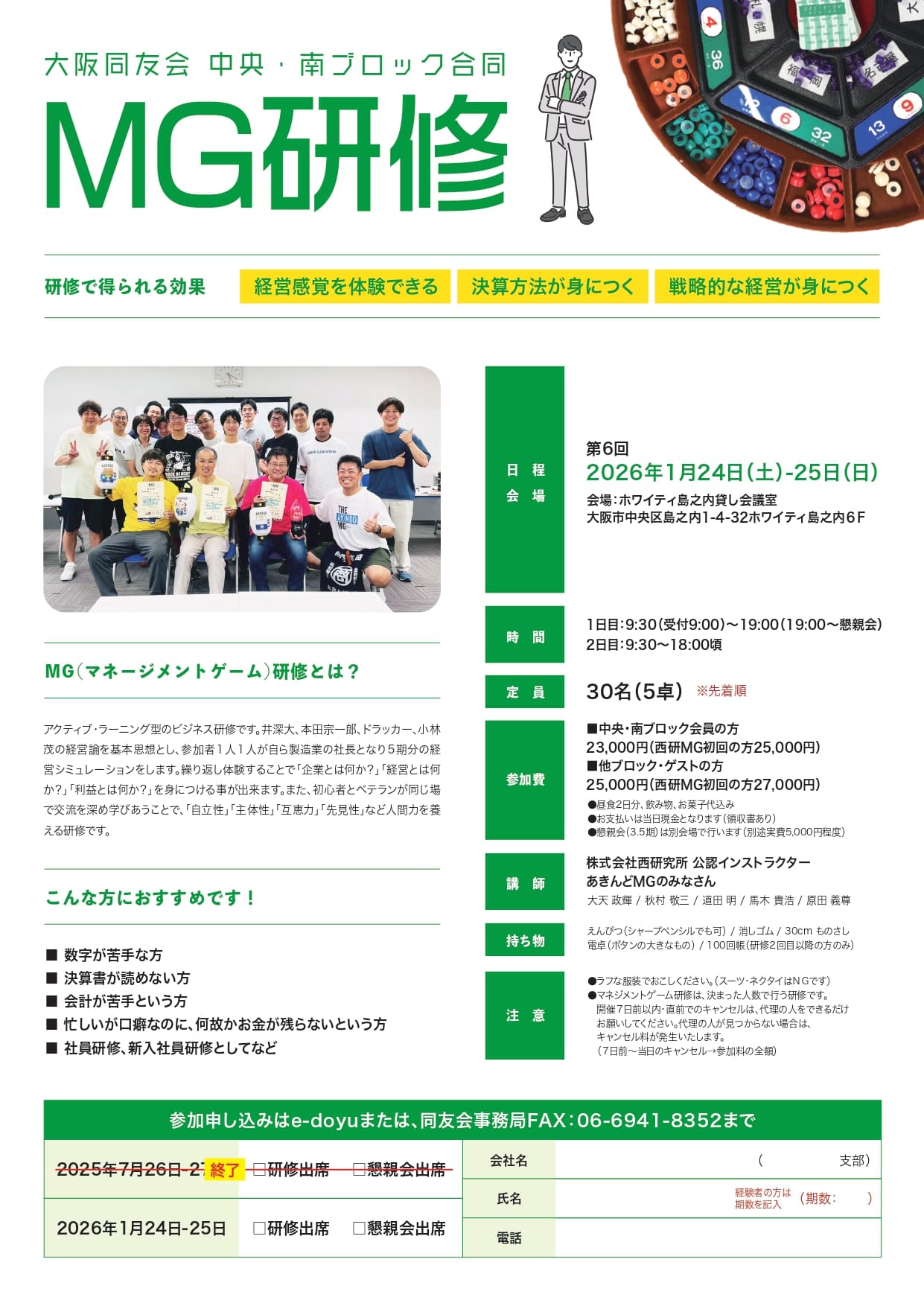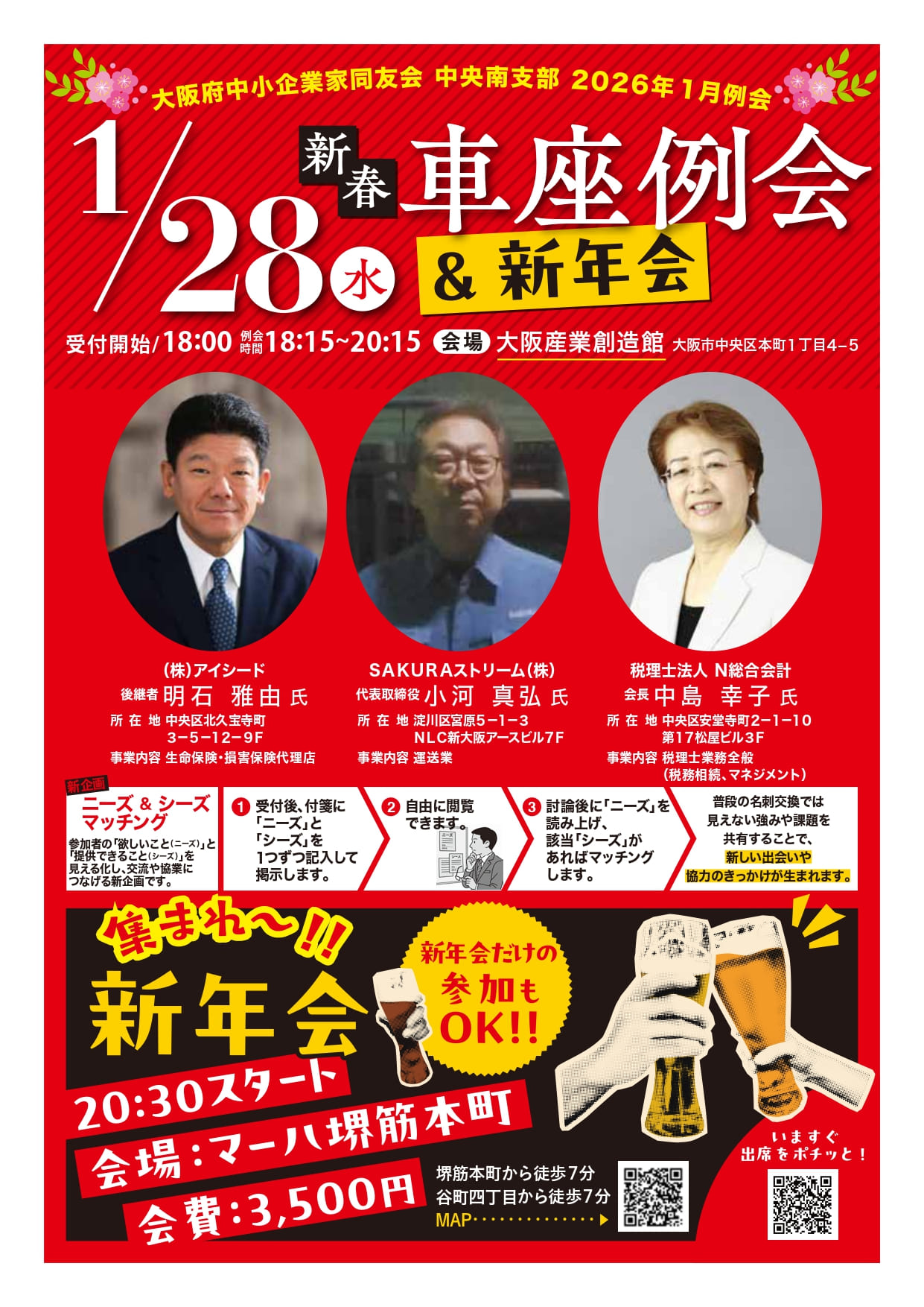 北第一支部北第二支部 2026/01/22 (木) 18:15 「こころの元気100%」の社会を目指して ~理念実現に向けてひたむきに実践する姿~(2026/01/22) 大阪北エリア 経営指針の作成経営体験報告 大阪北ブロック 詳細はこちら