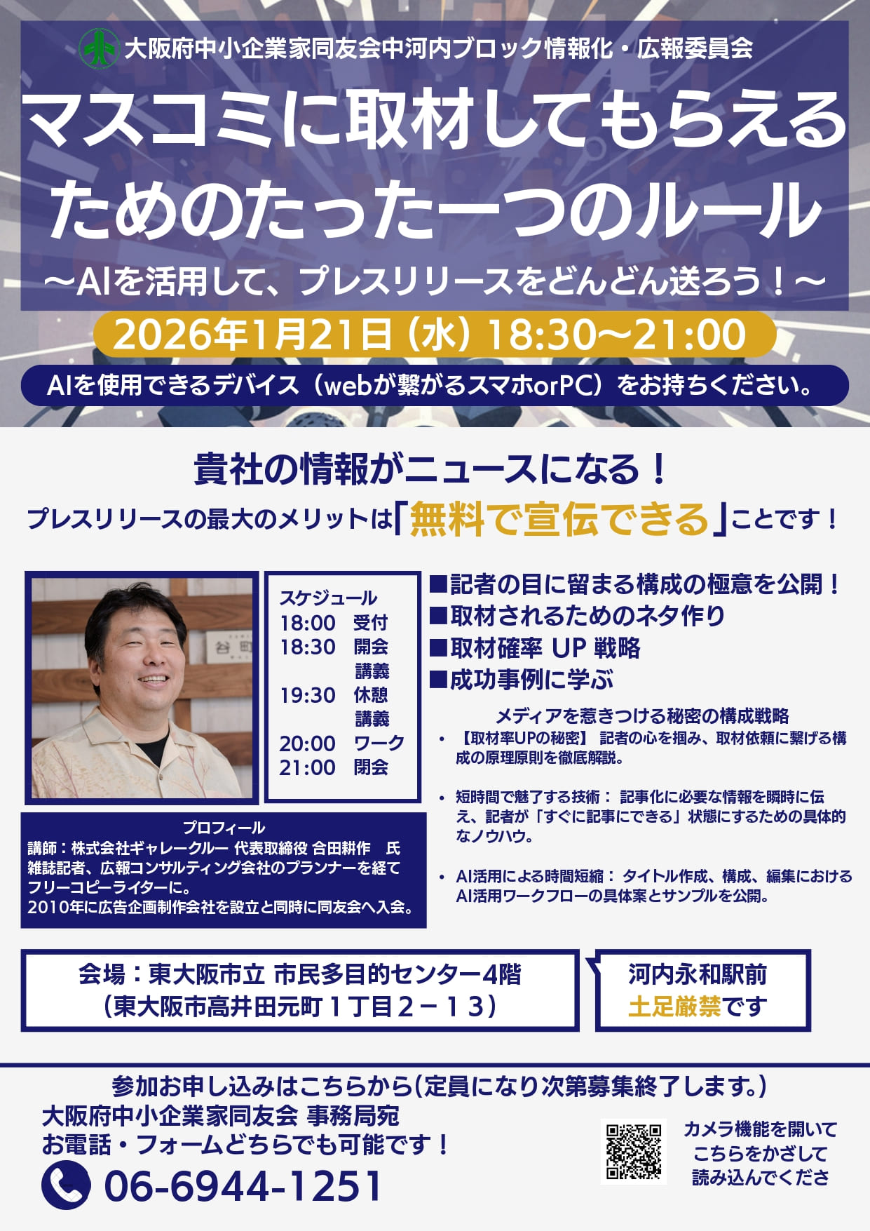 2026/01/21 (水) 18:30 マスコミに取材してもらえるためのたった一つのルール ~AIを活用して、プレスリリースをどんどん送ろう!~(2026/01/21) 勉強会・セミナー 大阪中河内ブロック 情報化・広報委員会 詳細はこちら