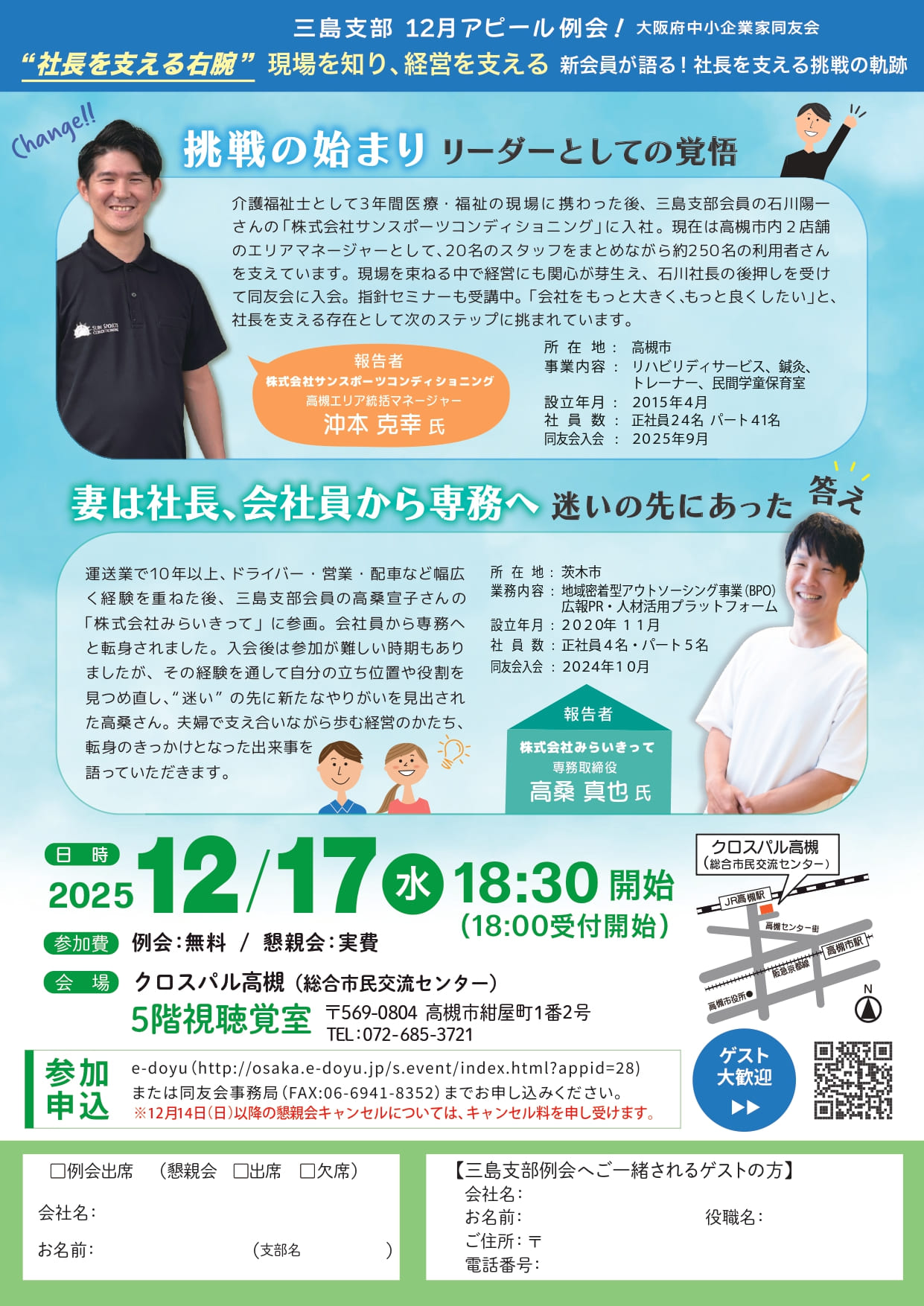 三島支部 2025/12/17 (水) 18:30 “社長を支える右腕”現場を知り、経営を支える〜新会員が語る!社長を支える挑戦の軌跡〜(2025/12/17) 大阪北エリア 経営体験報告経営者の責任経営指針の作成 大阪北ブロック 詳細はこちら