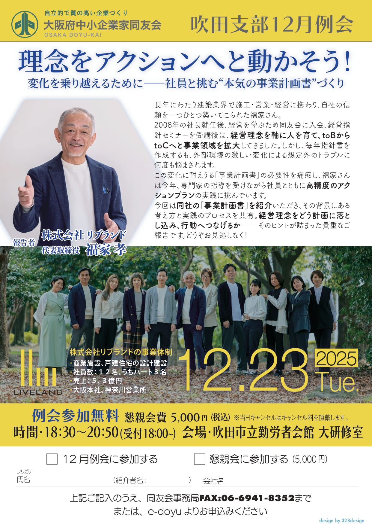 吹田支部 2025/12/23 (火) 18:30 理念をアクションへと動かそう! 変化を乗り越えるために〜社員と挑む“本気の事業計画書”づくり〜(2025/12/23) 大阪北エリア 経営体験報告経営理念の実践経営指針の作成 大阪北ブロック 詳細はこちら