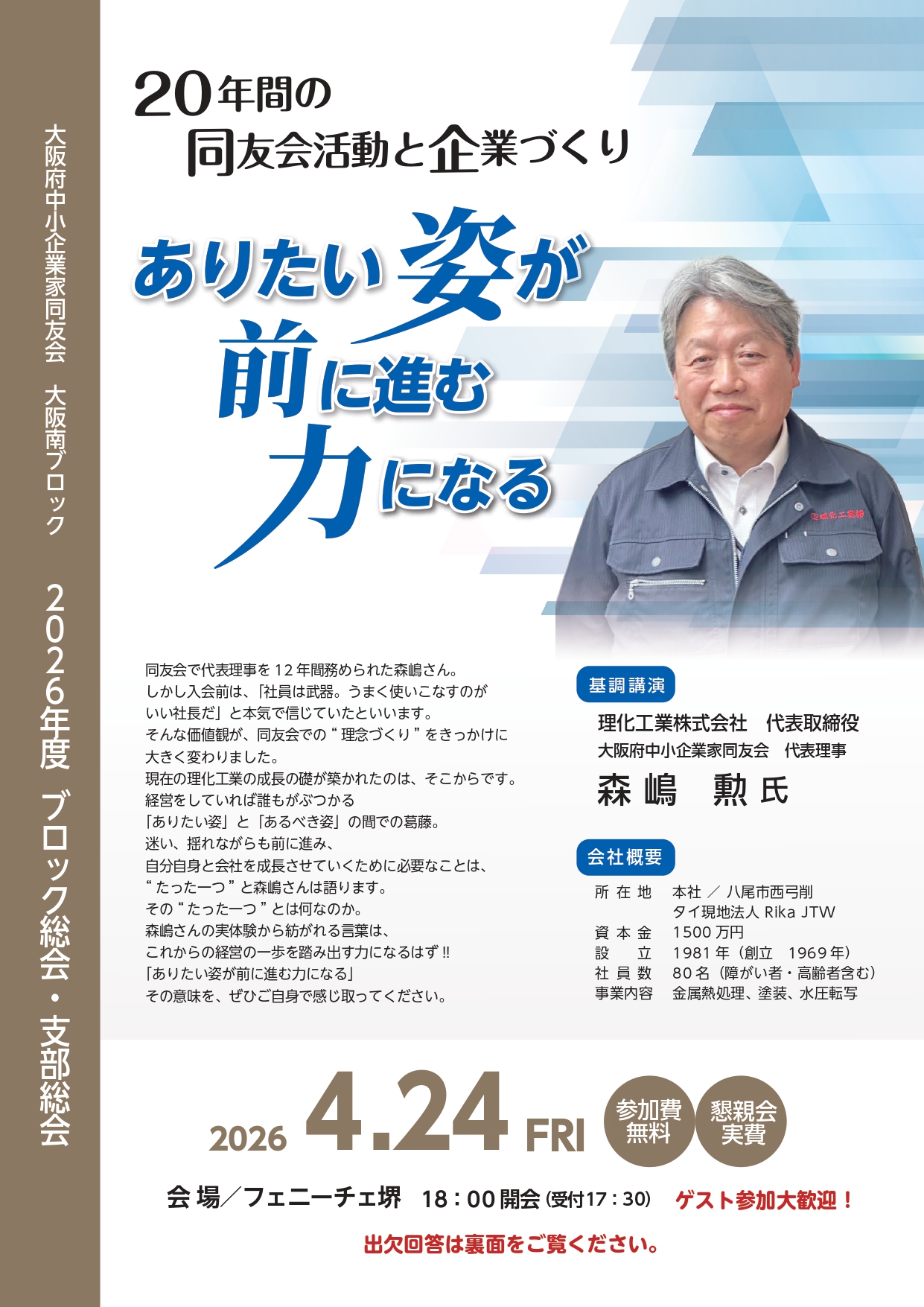 EASTさかい支部河南支部かんくう支部さかい浜支部 2026/04/24(金) 18:00 2026年度大阪南ブロック・支部総会(2026/04/24) 泉州エリア大阪南河内エリア 人を生かす経営経営体験報告経営理念の実践 大阪南ブロック 詳細はこちら