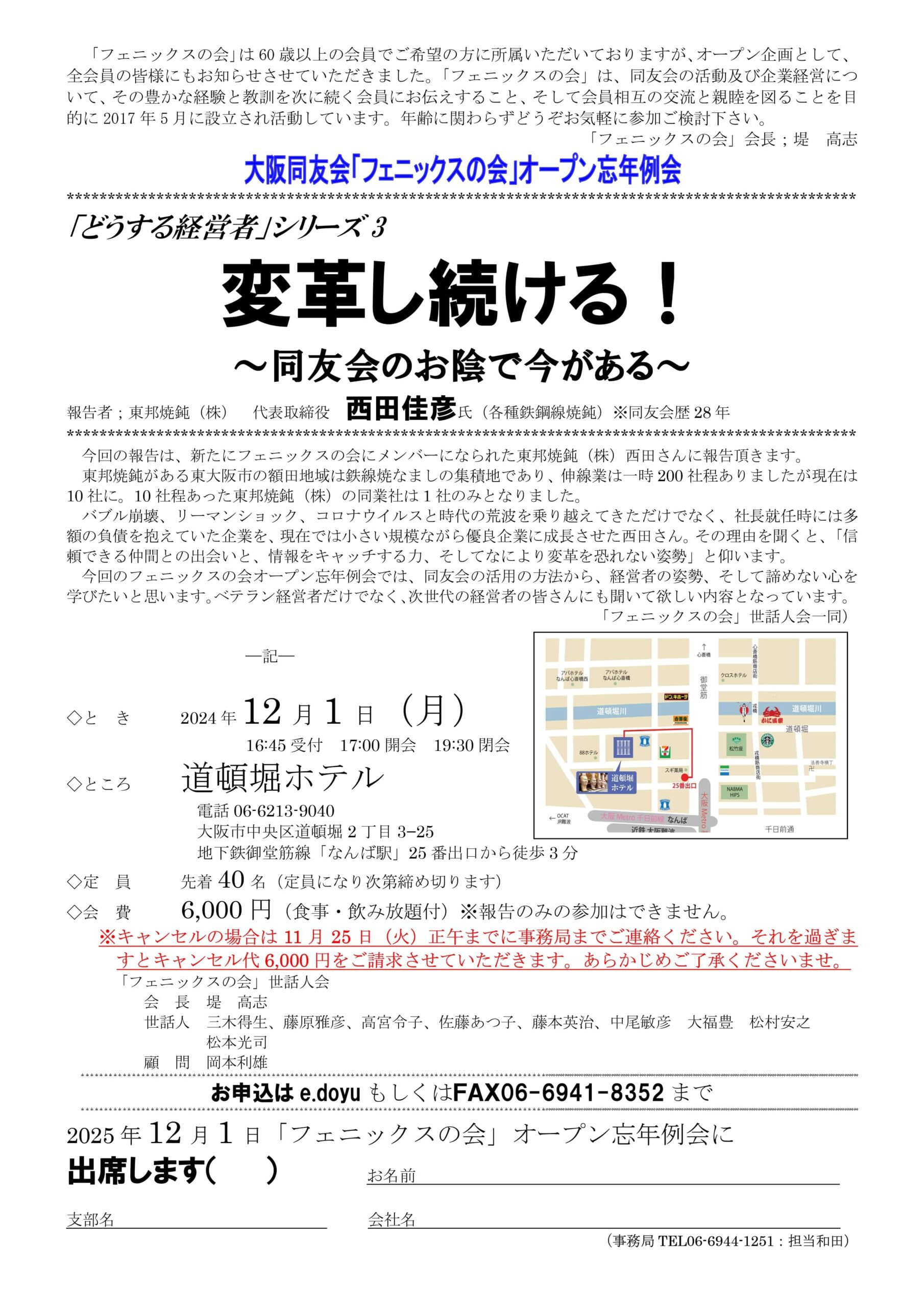 フェニックスの会 2024/12/01(月) 17:00 「どうする経営者」シリーズ3 変革し続ける! ~同友会のお陰で今がある~ 大阪北エリア大阪中央エリア大阪中河内エリア大阪南エリア泉州エリア大阪南河内エリア 経営体験報告経営者の責任事業承継付加価値を高める自社の理解と対応同友会を知る フェニックスの会 大阪南ブロック大阪北ブロック大阪中央ブロック大阪中河内ブロック 詳細はこちら