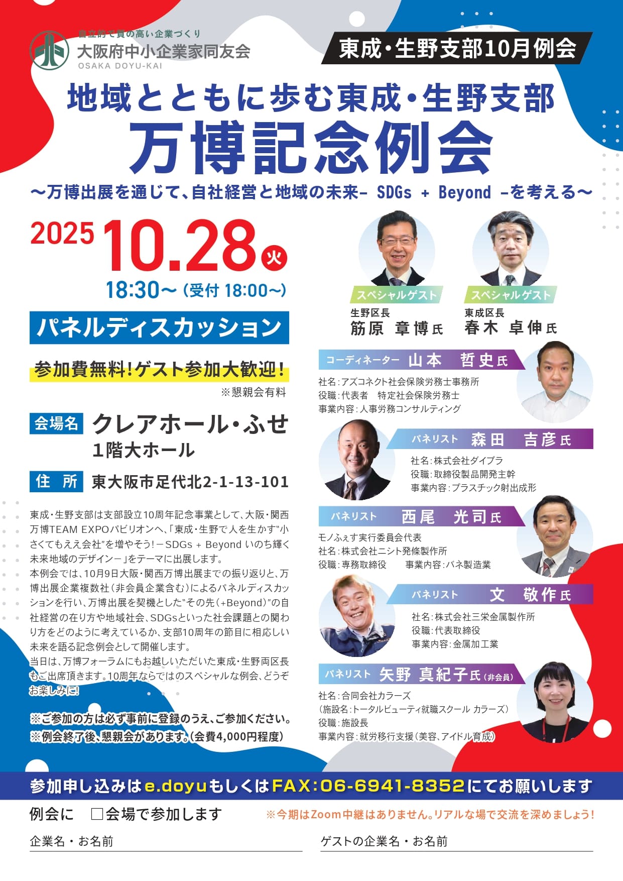東成・生野支部 2025/10/28(火) 18:30 地域とともに歩む東成・生野支部 万博記念例会 ~万博出展を通じて、自社経営と地域の未来- SDGs + Beyond -を考える~(2025/10/28) 大阪東エリア その他・交流会 大阪東ブロック 詳細はこちら