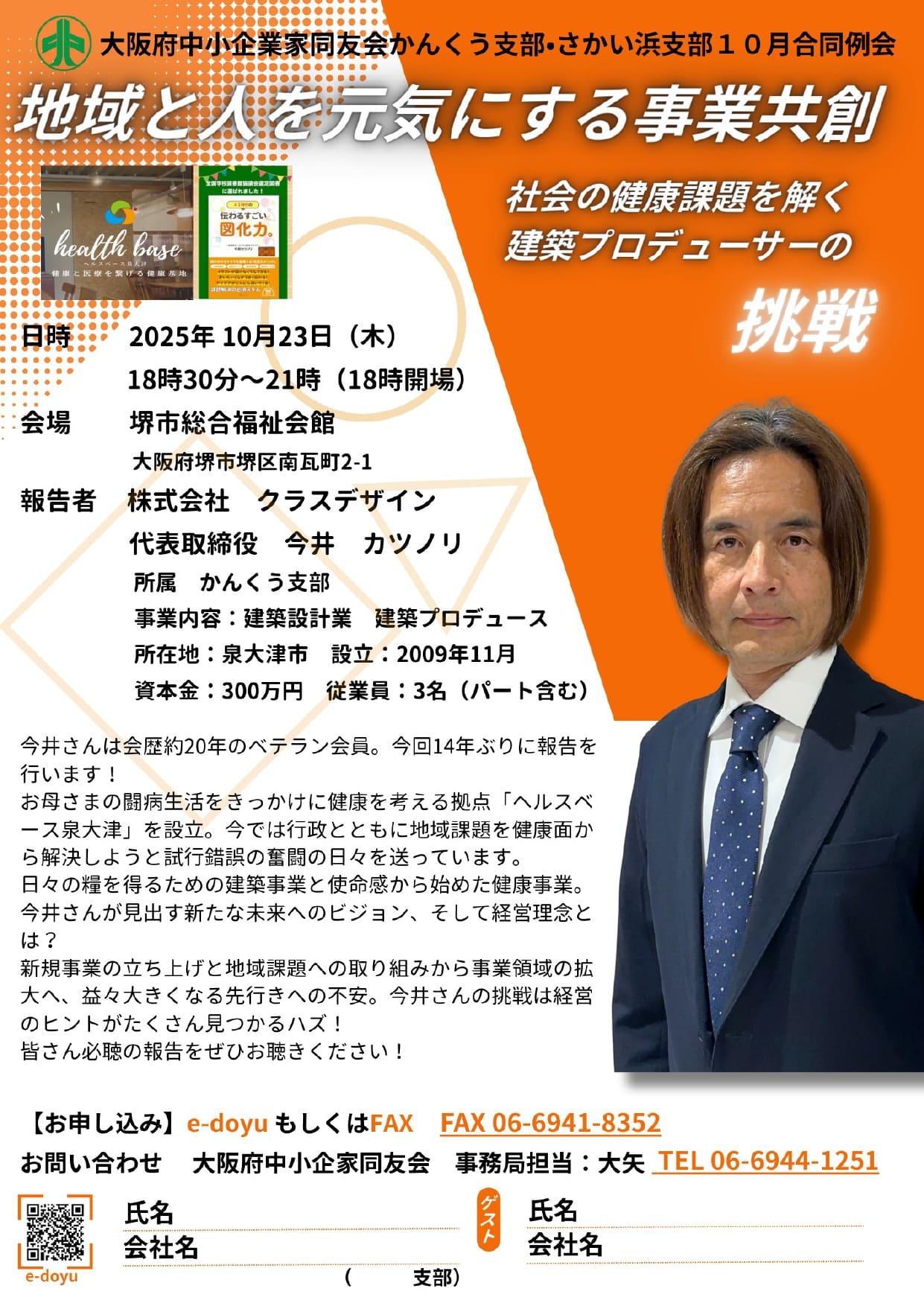 かんくう支部さかい浜支部 2025/10/23 (木) 18:30 地域と人を元気にする事業共創 ~社会の健康課題を解く建築プロデューサーの挑戦~(2025/10/23) 大阪南エリア 経営体験報告経営理念の実践 大阪南ブロック 詳細はこちら